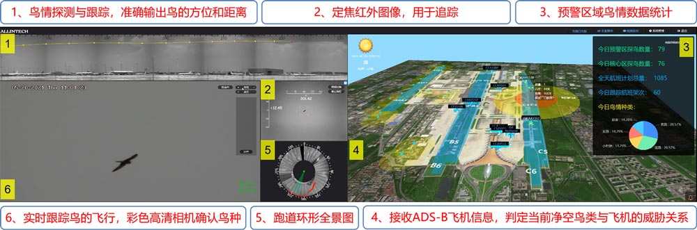 ●  無源光電技術體制的低空鳥情探測系統,實現從地面開始到低空區域的鳥情探測、跟蹤和測距。自主增程算法提高對各種氣象條件的適用性和鳥情截獲概率,準確動態獲取鳥情位置和速度,自動獲取鳥類高清切片,精準掌握鳥情種類分布,形成飛行區低空鳥情大數據,為機場精準治鳥提供關鍵性數據支撐。