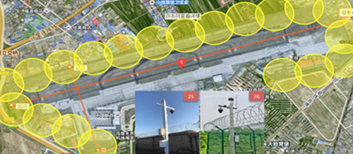 圍界全景式光電偵測系統在部署及防控威力范圍示意圖