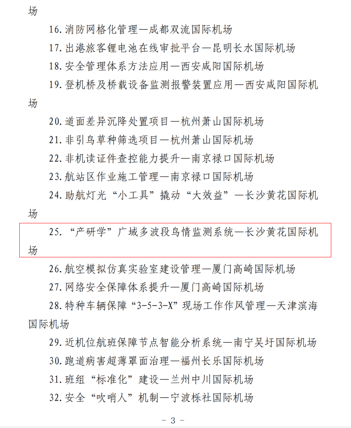 近日,在中國民航機場協會組織展開了“2022年度運輸機場安全管理優秀案例征集工作”。由長沙黃花國際機場報送的“產研學”廣域多波段鳥情監測系統項目從410個候選案例中脫穎而出,榮獲2022年度“安全管理優秀案例卓越獎”。